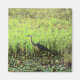 A photograph of a Great Blue Heron walking through a pond. The pond's surface is covered with water lilies. The pond is surround with stalks of green plants, which is bordering a meadow. Photograph Copyright ©2021 Kimberly J Tilley.
