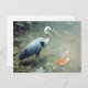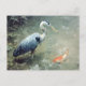 Graceful heron stands near vibrant koi fish in a misty pond surrounded by calm greenery, a tranquil scene highlighting nature's harmony and beauty.