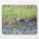 A photograph of a Great Blue Heron walking across a pond. The pond is covered in water lilies. The pond is bordered by green stem plants. Image Copyright ©2021 Kimberly J Tilley.