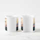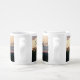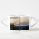 This his and hers mug features a landscape photo of a scenic sunset creating a silhouette of green trees, branches and leaves in the foreground. As the sun sets, nature paints the rolling hills with a blueish tinge creating a beautiful silhouetted skyline against a light pink sky. The sun, peeking from just behind the leaves and clouds, allows the sunlight to shine brightly as it reflects off the edges of the glowing clouds in the distant sky. The suns rays fan out across the sky.