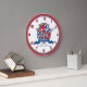 Knights style shield monogram letter H art name simple numbered wall clock in shades of red, blue white and gray. Personalize with your own name and name meaning for a personalized touch to your child's bedroom or nursery, this example is for names starting with the letter H. Currently reads Harvey Battle worthy. A blazing iron, strong and capable. Unique shield drawing, bird, crown, graphic art, name research, wording and design by Sarah Trett. www.sarahtrett.com for www.mylittleeden.com