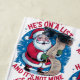 A fun, festive, and colorful cartoon illustration of Santa Claus happily holding a long, rolled-up "Naughty/Nice List." The background is a vibrant blue with white snowflakes and evergreen trees, enclosed by a circular border. Bold, red and white text prominently features the phrase: "HE'S ON A LIST AND IT'S NOT MINE." This design has a distinct, appealing retro or vintage feel, perfect for holiday apparel or greeting cards.