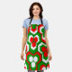 This apron has a Christmas geometric design of hexagons in sets of three that look like flowers in red, white, and green.