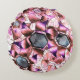 Hexagons surrounded by pinkish petal-like shapes round pillow