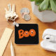 This Halloween and classic one simple word quote retro old school style image design features orange color lettering with black outline backing, cute barely scaredy boo eyes, periwinkle blue purple dots and black background color to match on many products.