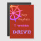 Funny cruise magnetic card for your cabin door with a ship's wheel says "Hey Captain - I wanna DRIVE." (Every true seaman knows the captain doesn't drive the boat - he STEERS the SHIP)