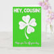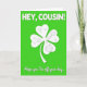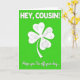 This card features a saturated lime‑green background with a faint linen-like texture, setting a lively St. Patrick’s Day scene 💚. Centered on the front is a large white four‑leaf clover with soft shading that makes it look slightly raised from the surface. Each leaf carries subtle concentric circles, like golf‑ball dimples, turning the classic lucky symbol into a gentle tee-time joke. Above the clover, “HEY, COUSIN!” sits near the top in white sans‑serif letters, giving the greeting an easy, close-to-you feel. Across the clover, the line “Hope you Tee off your day...” appears in white cursive-style lettering, angled so it feels like it’s chatting right to the reader ☘️. A thin white border runs around the edge, keeping everything neatly framed and focused. The bright green and crisp white pairing keeps the look energetic while the clover’s soft shadows add depth. The final detail is the clover’s dimpled leaves and the slim white border set against the textured lime‑green field.
