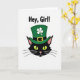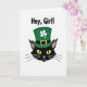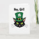This card features a stylized black cat’s head centered on a bright white background, giving the scene a festive St. Patrick’s Day look ☘️. The cat wears an emerald green top hat with a white four-leaf clover on the band and a small golden buckle that adds a polished accent. Its chartreuse eyes glow against the dark fur, and a soft pink nose and lightly pink inner ears bring a gentle, affectionate charm, like it’s locking eyes with someone it trusts 💚. Long black whiskers sweep outward from both cheeks, keeping the face simple but expressive. Near the top of the card, bold black sans-serif text reads “Hey, Girl!” and sits above the cat like a friendly callout. The limited palette—black, green, white, gold, and pink—creates strong contrast that draws the eye straight to the hat and those bright eyes. The clover sits crisp and white on the hatband, and the buckle is a warm gold rectangle that stands out against the green. The cat’s head is centered with plenty of white space around it, while the text remains aligned above, leaving the hat and clover clearly visible.