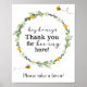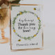 Favor sign featuring a watercolor wreath of greenery and yellow flowers with buzzing bees and the words "Hey Honey, thank you for BEE-ing Here" in a fun script.