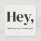 A sleek and chic business card featuring the playful phrase Hey, been trying to meet you boldly printed on the front! Made for the modern, stylish individual, this card showcases a minimalist design with a twist of vibrant colors. The eye-catching light ivory background beautifully contrasts with the striking black font, making it an instant attention-grabber. On the back, we've incorporated a handy QR code that effortlessly directs people to your website, name, and contact information, ensuring they can easily reach you. Not limited to professional networking, this card can be used as a flirty and funny icebreaker for those daring encounters in the dating scene. Impress with confidence and leave a lasting impression with our business card.