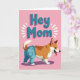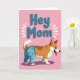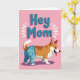 This card features a cartoon-style, short-legged dog in the lower half, standing against a bubblegum-pink background with an upbeat, friendly look ❤️. The dog has golden-brown and creamy white fur, pointed ears, and a curled tail, and it wears light blue denim-style pants with small stitched details and pockets that add a cute, humanlike touch. Its wide, open smile and little tongue give it the kind of eager expression you might see when greeting someone it adores. Near the top, the words “Hey Mom” sit centered in chunky, three-dimensional letters colored blue-teal, with a soft pink shadow behind them for depth. Thin white lines radiate around the text like a cheerful shout, turning the greeting into a lively moment. The roomy layout keeps the focus on the dog and the message, like a quick, affectionate call across the room 🌼. The background stays solid pink, while the white rays and teal lettering stand out crisply above the dog’s head.