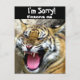 A tiger with it's mouth wide open ,teeth showing, great for: Sorry,forgive me,hey! and more.