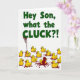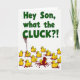 This design shows a two-part digital illustration that contrasts a light cartoon look with a darker joke. Across the top, large green cartoon-style lettering reads “Hey Son, what the CLUCK?!,” with “CLUCK” set in thicker letters. From that word, a dark red liquid drips downward in a long streak, linking the headline to the scene below. In the lower half, many small yellow duck-like bath-toy figures are scattered across a bright white background, their round bodies, orange beaks, and dot eyes giving them a cute, friendly presence 🐰. The setup feels oddly intimate, like a teasing message between family or close friends, even as the red drips turn the humor sharp. Around several of the little birds, the same red liquid appears as splatters and puddles, and one central figure is completely soaked in deep red 🐇. The white space makes the green text and the red stains stand out strongly, with the fully red-soaked bird near the center and other yellow figures spaced around it.