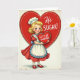 This Valentine's Day card shows a blonde, cherub-like little girl standing in front of a huge red heart with a dotted stitch outline. She has big blue eyes, rosy cheeks, and a gentle smile that feels warm and kind. She’s dressed like a tiny baker, wearing a white chef’s hat with a blue accent, a white apron with light-blue ruffles, and a red dress with white polka dots. In her hands, she holds a smaller red heart that looks a bit sparkly, and it reads “LET’S BE VALENTINES” in clear, easy-to-read letters. Behind her, on the large heart, the words “Hi SUGAR!” appear near the top in a flowing script style that stands out against the red. The color mix of red, white, and blue gives the whole scene a sweet, old-fashioned Valentine feel ❤️💌. It’s a cozy, candy-like design that pairs perfectly with a heartfelt note and maybe a little chocolate 🍫, so share your Valentine’s Day feelings with someone you care about.