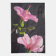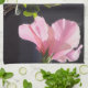 Pink and Black - This Kitchen Towel is a lovely way to add a bold yet softly modern touch from the garden. The hibiscus flowers, in the original photograph by MaeFlowers on the towel, are bubblegum pink against an almost black background. The photo is a profile of the flowers in full bloom, with ruffled petals and yellow pollen stem. Sunlight shines through the spring green leaves, and a new flower bud emerges.