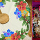 Hawaiian hibiscus and Christmas holly tree skirt. Ecru, off-white color with big floral pattern around the edge. Flowers of orange, yellow and blue make swags with holiday greenery and red berries.