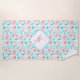 A pretty aqua teal and pink flamingo and hibiscus flower pattern is the background on this tropical themed beach towel. At the center is an ornate white banner with an image of a single pink flamingo.
