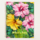 Tropical hibiscus and leaves weekly planner. Personalize this pretty, spiral bound book with a name on the front, or other text. Use one or two lines. Pink and yellow hibiscus flowers, along with big green jungle leaves, cover the front and back of planners in two size, 5x8 or 8x11. Makes a nice gift for a bride planning a wedding, or bridesmaids as thank-you gifts.
