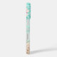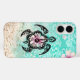A stylized tribal turtle design with intricate patterns is centered on a turquoise background, surrounded by delicate pink hibiscus flowers. The scene evokes a fun, beachy feel with its blend of nature-inspired elements.
