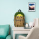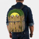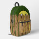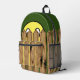 Design features a green background to the image of a shy, smiling emoji hidden behind a wooden fence. Image of fence can be seen on three sides of backpack. Fun design, and sure to start a conversation!