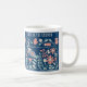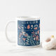 Stay entertained while you sip your favorite hot beverage with this illustrated coffee mug. That's because this coffee mug is actually a fun hidden picture game with 9 illustrations of familiar objects hidden inside a pretty garden. The graphic in mint green, coral and cream or ivory is set against a navy blue background.