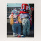 Boy and girl dolls dressed up in clothes, cap and hat adorned with USA, stars and stripes, American flag, and red white and blue, cover their eyes and lean against the chrome grill and headlights of this blue antique at a car show. Have some family fun putting this cute puzzle together.
