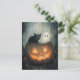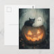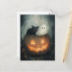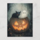 A fun Halloween scene with a ghost and a black cat hiding inside a Jack o lantern pumpkin