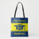High school Graduation Day Class of 2024 custom Tote Bag. Personalized gift idea for graduating seniors, college grads and university students. Modern tassel cap logo with date and name. Blue and yellow template example. Double side print.
