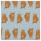 Cute illustrations of highland cattle in reddish brown are set against a background of pale blue polka dots on this patterned fabric.