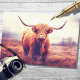 Enjoy this majestic Highland Cow in a foggy landscape setting on decoupage paper! Its fabric texture overlay adds a touch of sophistication to your crafts. Embrace the misty magic of the Highlands. Order now!