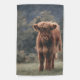 Highland cow calf autumn grass field photograph. Stunning young calf of highland Scottish cattle on an autumn grassy field with muted colors. Beautiful dark hairy orange coat contrasting with light yellow green grass and trees in bokeh in background.