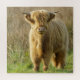 A young Highland cow with an unusual white head standing in the reed grass. These highland cattle are probably about 18 months old looking at those horns.