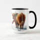 This charming coffee mug showcases a beautifully detailed image of a Highland cow. The cow, with its long, shaggy coat and distinctive curved horns, is depicted walking away, glancing back over its shoulder. The scene captures the cow’s gentle and curious nature, set against a simple, rustic background. The black print style adds a classic, timeless feel to the design.