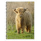 A young Highland cow with an unusual white head standing in the reed grass. These highland cattle are probably about 18 months old looking at those horns.