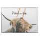 Highland cow portrait custom name initial monogram. Portrait photograph of a majestic orange brown highland cattle on a foggy day with white background.
