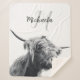 Highland cow portrait custom name initial monogram in black and white. Portrait photograph of a majestic highland cattle on a foggy day with white background in black and white.