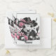 A cute black and white Highland cow decorated with a stylish black hat adorned with pink flowers, showcasing charm and artistic design.