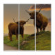 Highland cows standing on a hill at sunset. One of the cows sticking out his tongue.