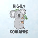Highly Koalafied - Highly Qualified. A cute gray Koala cartoon graphic drawing with a koala bear pun. Funny and sweet wild animal design. Australian wild baby animal on a eucalyptus tree with gum leaves