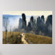 Oil landscape painting in the style of Andrew Wyeth of someone hiking a trail through an imaginary national park named "Devil's Flutes".