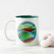 An abstract landscape with vibrant colors and textures showing hills floating on ice in shades of green, blue, cyan, red, and pink.