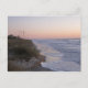 A photography postcard of the beautiful breathtaking shore line view of Hilton Head Island, South Carolina. Photo was taken just as the sun had risen over the ocean. The waves are gently rushing into the grassy banks of the beach.