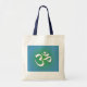 A simple white OM symbol on a green and blue orb background. It's serene and stylish. Great to wear to yoga class, or give as a gift!