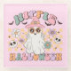 Cute, colorful, fun Hippie Halloween coaster features a hippie ghost with pink witch hat, text that reads Hippie Halloween, and some flowers and little bats and skulls in lavender, melon, aqua, and pink!