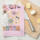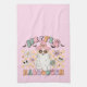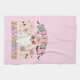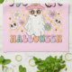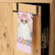 Cute, colorful, fun Hippie Halloween kitchen towel features a hippie ghost with pink witch hat, text that reads Hippie Halloween, and some flowers and little bats and skulls in lavender, melon, aqua, and pink!