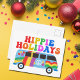 Hippie Holidays in cute, retro 70s font and fun colors over a vintage van with flowers and peace signs. This pretty, colorful hippy Christmas postcard is a great throwback to the seventies.