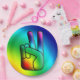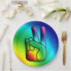 A graphic design of a rainbow peace sign sign by artist/designer Charmaine Paulson on a party plate.