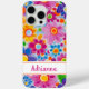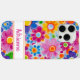 Make a retro statement with this groovy 70s inspired hippie flower power floral iphone 15 pro max phone case! It's modern and trendy with bright multi-colored painted flowers. Make it uniquely yours with your name in a modern script font in pink. It will look fabulous on your phone!