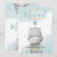 A beautiful boy's birthday invitation with a cute hippo on and blue watercolor brushstrokes on.