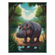 A solitary hippopotamus stands by a calm river, surrounded by lush greenery. The scene captures the serenity of nature under a bright sky.